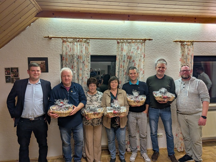 2. Vorstand Markus Otzmann, ebenfalls neu im Amt, ehrte dann zusammen mit 1. Vorstand Daniel Ehret die langjährigen Vereinsmitglieder. Dieses Jahr standen Ehrungen für 50, 40 und 25 Jahre an. Jeweils eine kurze Vorstellung der Person, dann Überreichung der Vereinsnadel und dem Präsentkorb. Wie schon die Vorjahre konnten einige der Geehrten an dem Abend nicht teilnehmen. Es wurden geehrt für 25 Jahre: Thomas Brosi, Daniela Kluge, Christine Meyer und Margit Bourgeois. Für 40 Jahre: Bernd Bärreis, Anita Kreppel und Marga Maiss. Für 50 Jahre: Horst Birkmann, Klaus Pfister, Thomas Strobel, Detlef Wagner und Thomas Hofmann. Allen Jubilaren einen herzlichen Dank für ihre Treue und Einsatz. Mit guter Stimmung ging die Veranstaltung dann bis weit in den Sonntag.
